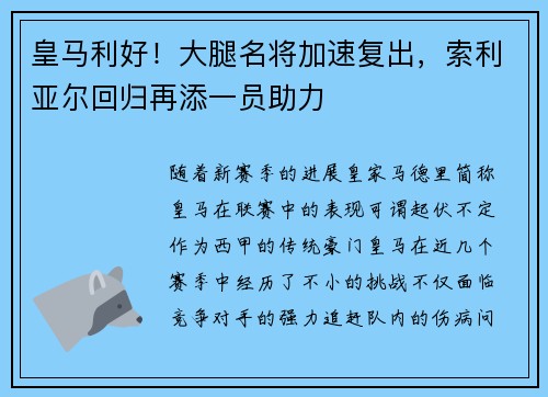 皇马利好!大腿名将加速复出,索利亚尔回归再添一员助力